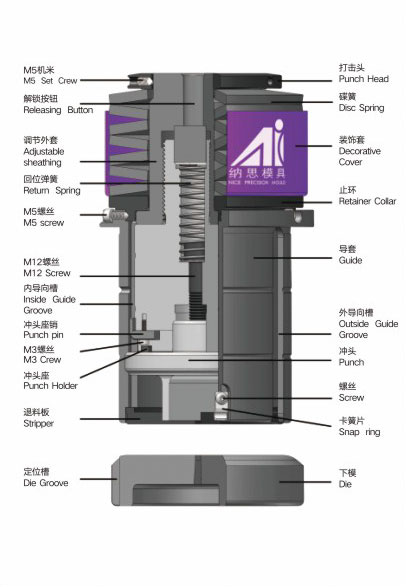 - 標(biāo)準(zhǔn)模具A、B工位的止環(huán)采用雙面錐度設(shè)計(jì),可以雙面使用,增加沖頭刃磨量。